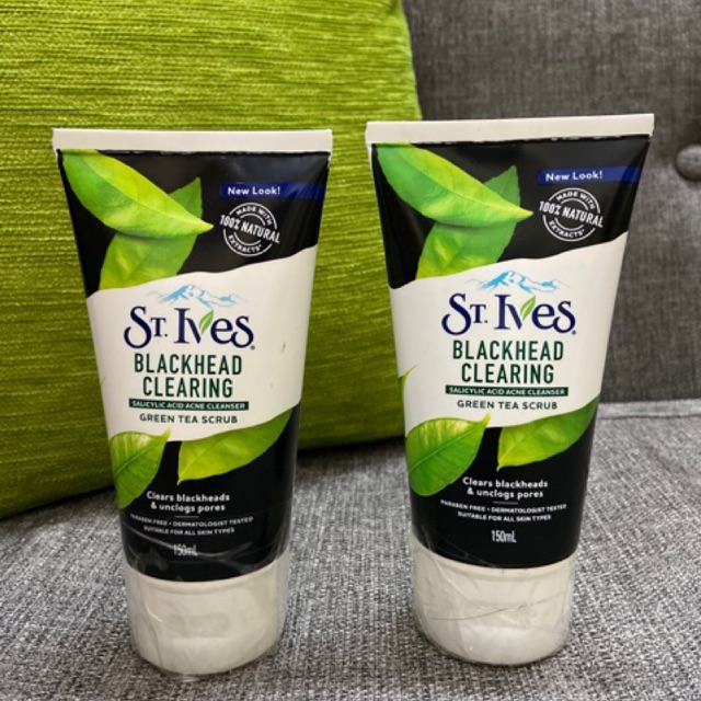 Tẩy tế bào chết st ives blackhead clearing green tea scrub dạng tuýp bự bao bì giống các sản phẩm sữa rửa mặt và tẩy tế bào chết của hãng.