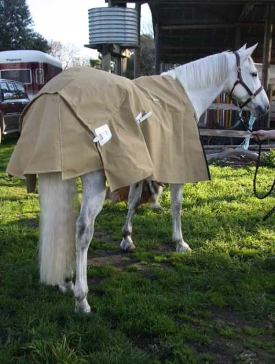 Unlined canvas horse rug 21oz ripstop fabric adjustable chest strap no lining waterproof leg straps tail flap colour.
